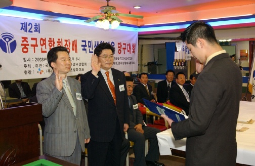 한편 개회식 말미에는 당구연합회 발전과 활성화에 기여한 유공회원에 대한 표창장 수여식이 열려 전용정 정의도 연합회 운영위원은 구청장 표창장을, 변순조 부회장 황규화 운영위원은 새천년민주당 중구지구당 정대철 위원장 표창장을, 엄준환 김중용 운영위원은 한나라당 중구지구당 박성범 위원장 표창장을, 엄태주 방상길 회원은 중구 생활체육협의회 김유성 회장의 표창장을 각각 받았다.