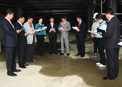 ◇지난 10일 중구의회 의원들이 회현동 문화체육센터공사 현장을 찾아 공사에 대한 문제점이나 개선할 사항은 없는지 확인하기에 앞서 보고를 받고 있다.