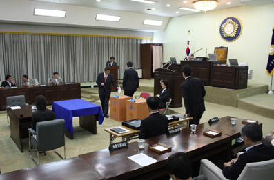 ◇지난 4일 열린 제4차 본회의에서 9명의 의원 중 4명이 불참한 가운데 5명만이 참석해 부의장 선거를 하고 있다.