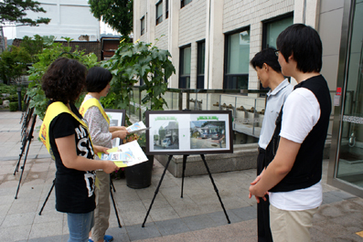 ◇지난 13일 구청 정문 앞에서 교통지도과 직원들이 중구민에게 Green Parking 사업에 관해 설명하고 있다.