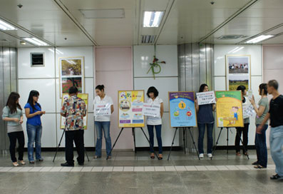◇지난달 27일 을지로4가 지하철역에서 중구보건소 직원들이 지하철이용객을 대상으로 금연과 아침밥 먹기 캠페인을 전개하고 있다.