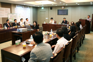 ◇중구의회 의원들이 지난달 29일 중구의회 소회의실서 중부교육장 등과 간담회를 갖고 있다.