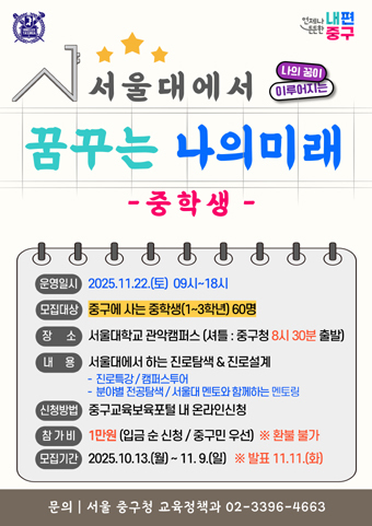 서울 중구가 오는 11월 15일과 22일, 서울대학교 관악캠퍼스에서 관내 초·중학생 및 학부모를 대상으로 하는 2025 서울대연계 진로심화 프로그램 '꿈꾸는 나의 미래'를 운영한다.