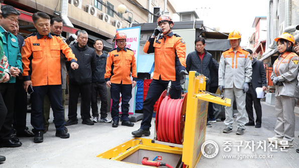 특히 이날은 김길성 중구청장과 김준철 중부소방서장 등이 직접 참석해 상인들과 함께 지하소화장치함 사용법을 익히며 훈련을 참관했다.