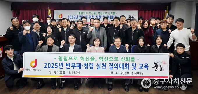 서울특별시 중구시설관리공단은 11월 19일 공단본부 대회의실에서 임직원 54명이 참석한 가운데 반부패‧청렴 실천 결의대회 및 청렴교육을 실시했다고 밝혔다.