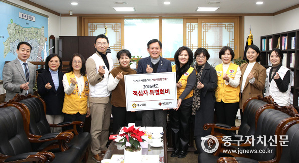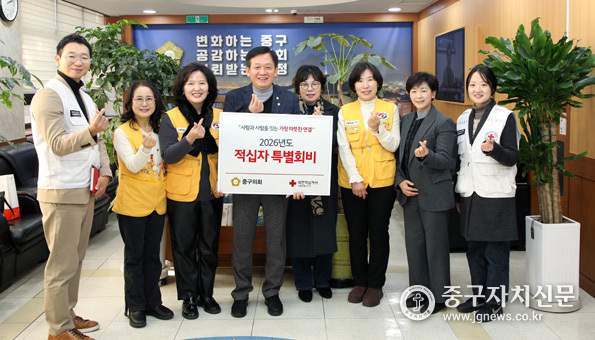 중구의회(의장 윤판오)는 1월 8일 의장실에서 ‘2026년 적십자 특별회비 전달식’을 갖고 대한적십자사봉사회 중구협의회에 성금을 전달하며 새해 첫걸음을 나눔으로 시작했다.
