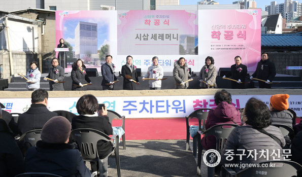 이날 착공식에는 김길성 중구청장을 비롯해 박성준 국회의원, 윤판오 중구의회 의장, 이정미 소재권 의원, 주민과 관계자 등 100여 명이 참석했다. 행사에서는 주차타워 건립에 대한 설명, 시삽 퍼포먼스 등이 진행됐다.