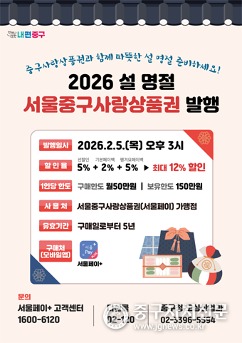 김길성 중구청장은 “설 명절을 앞두고 발행하는 이번 상품권이 주민들의 명절 준비 부담을 덜고, 소상공인에게는 매출 증대의 기회가 되길 바란다”며 “앞으로도 침체된 소비 심리를 살리고 소상공인에게 실질적인 힘이 되는 민생 정책을 지속적으로 추진하겠다”고 밝혔다.