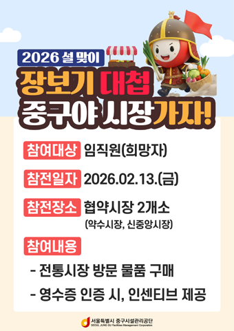 서울특별시 중구시설관리공단(이사장 직무대행 이동성)은 설 명절을 앞두고 전통상권 활성화와 지역사회 상생을 위해 2월 13일 ‘중구야 시장가자’ 캠페인을 추진했다.