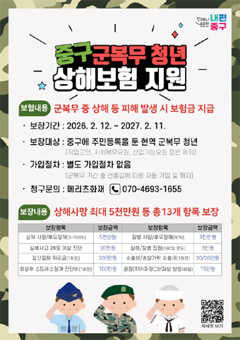 서울 중구(구청장 김길성)가 올해‘군복무 청년 상해보험’을 첫 시행한다. 중구에 주민등록을 둔 군 복무 청년이라면 무료로 자동 가입된다. 군 복무 중 겪을 수 있는 사고나 질병으로부터 청년들을 보호하고 예기치 못한 경제적 부담을 덜어 주기 위해서다.