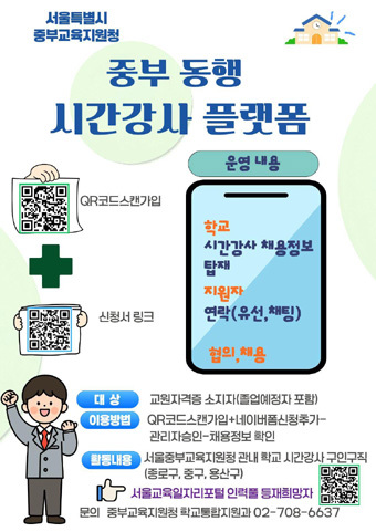 아울러 중부교육지원청은 시간강사 채용 지원을 위해 서울교육일자리포털을 활용한 시간강사 인력풀 등록을 지원하는 한편, 자체적으로 네이버 밴드를 통한 시간강사 인력풀(명칭: 중부동행시간강사 플랫폼)를 운영하여 학교와 시간강사를 보다 신속하게 연결할 계획이다.