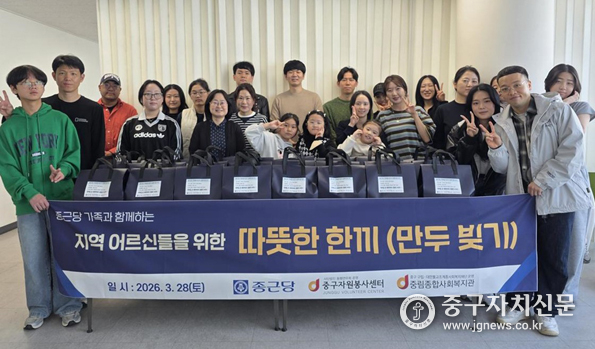 중림종합사회복지관(관장 이해경)은 지난 28일 종근당(대표이사 최희남) 가족봉사단과 함께 복지관 6층 행복나눔식당에서 '어르신께 드리는 따뜻한 한 끼' 만두 빚기 행사를 진행했다.