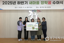 서울 중구(구청장 김길성)는 새마을운동 중구지회(지회장 김명곤)와 함께 지난 11월 4일 중구청 중구홀에서 새마을지도자 자녀들에게 장학금을 수여했다. 이번 수여식에서는 58명의 중·고·대학생 자녀에게 총 3천만원의 장학금이 전달됐다. 새마을운동 중구지회는 지역 발전을 위해 앞장서는 새마을지도자들의 자녀들에게 매년 장학금을 수여하며 성실한 학업과 봉사의 가치를 이어가도록 장려하고 있다. 이날 행사에서는 장학생들의 꿈을 응원하기 위한 선물도 전달됐다. 중구자원봉사센터의 공예 봉사단이 양말목으로 제작한 새마을로고 모양의 ‘꿈키링’ 70점을 마련했다. 초록색과 노란색 양말목으로 만들어진 꿈키링은 학생들뿐만 아니라 새마을지도자들에게도 인기 만점이었다. 한편, 새마을 운동 중구지회는 다양한 봉사 활동을 통해 지역 사회에 온정을 나누고 있다. 지난 1일 열린 ‘중구 남산동행 걷기 대회’에서 먹거리 부스와 바자회를 운영해 얻은 수익금을, 오는 12월 진행될 ‘취약계층을 위한 김장 만들기 행사’에 김장 재료비로 사용할 예정이다. 김길성 중구청장은 “장학금을 통해 학생들이 부모님의 지역사회 기여에 대한 자부심을 느끼고, 꿈을 키울 수 있기를 바란다”며 새마을 지도자들의 활동에