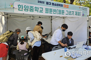 서울시중부교육지원청(교육장 강삼구) 관내 한양중(교장 서승현) 교내 동아리 학생들은 11월 1일 중구 덕수궁 돌담길 일대에서 열린 2025 중구 청소년 축제 ‘야호’에 참가했다. 올해로 11주년을 맞는 이번 축제는 청소년들이 주체가 돼 지역 사회와 소통하며 청소년 문화의 긍정적인 확산과 공동체 의식 형성에 기여했다. 중앙 동아리 경연 대회 무대 양쪽에는 ‘청소년 진로·직업 체험 Zone’과 ‘청소년 동아리 체험 Zone’이 각각 마련됐으며 약 30개의 부스가 설치됐다. 이곳은 청소년과 시민이 함께 어울리며 다양한 활동을 즐길 수 있는 다채로운 체험 공간으로 꾸며졌다. 한양중은 교내 동아리인 웹툰반과 뉴스포츠반이 참여해 각각 ‘웹툰 그리기’와 ‘밀래 말래? 던질래 말래? 뉴스포츠 할래?’ 체험부스를 선보였다. ‘웹툰 그리기’ 체험 부스는 약 140명의 시민이 참여하며 큰 호응을 얻었다. 웹툰반 학생들은 참여자들에게 웹툰 그리기의 기초를 안내하고 참여자들이 직접 캐릭터를 그려보며 웹툰 제작 과정을 체험할 수 있도록 도왔다. 주로 가족 단위 참가자들이 참여했는데 체험에 참여한 한 어린이는 “형들이 도와줘서 나도 캐릭터를 완성했다. 생각보다 쉽고 정말 재미있었다”며
