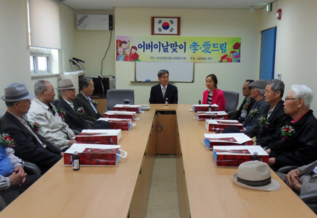 지난 7일 중구보훈회관 2층 회의실에서 저소득고령회원 10명을 초청, 카네이션을 달아드린 뒤 간담회를 갖고 있다.