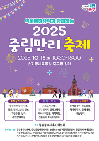 서울 중구(구청장 김길성)는 중림동 손기정체육공원 축구장 일대에서 오는 10월 18일 오전10시부터 오후 6시까지 ‘2025 중림만리 축제’가 열린다고 밝혔다.