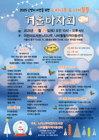 나비훨훨 지역아동센터(센터장 안성영)와 느티나무 어린이도서관(관장 김신아)은 오는 11월 29일(토) 오전 10시부터 오후 4시까지 지역사회 아동과 주민들이 따뜻한 겨울을 보낼 수 있도록 겨울 난방비 마련을 위한 바자회를 개최한다.