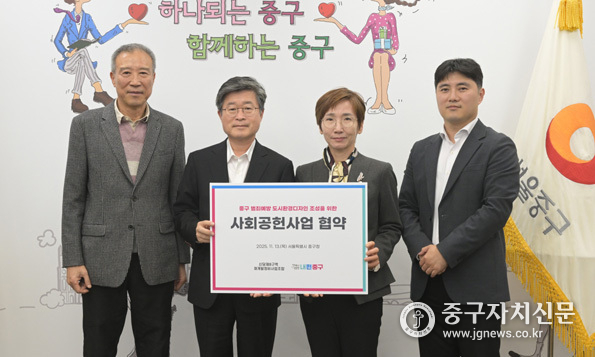 서울 중구(구청장 김길성)가 지난 11월 13일 신당8구역 주택재개발 정비사업조합(조합장 이정수)과 ‘범죄예방 도시환경디자인 조성을 위한 사회공헌사업 업무협약’을 체결했다.
