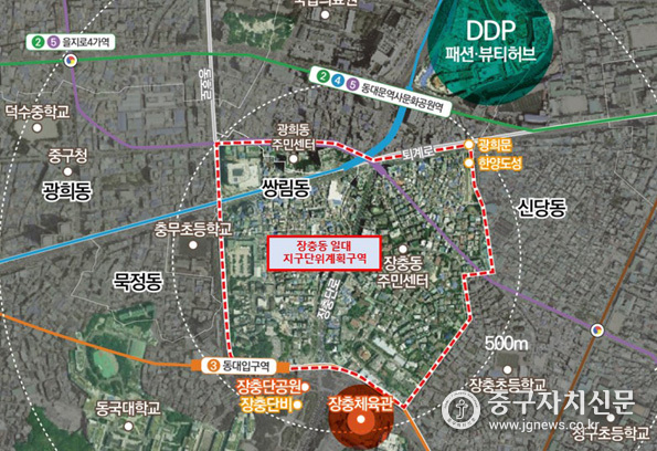 장충동 일대 지구단위계획구역은 40만7천329㎡ 규모로, 지하철 2·3·4·5호선(동대문역사문화공원역, 동대입구역)이 지나는 뛰어난 교통 여건을 갖추고 있다. 동대문디자인플라자(DDP), 장충체육관, 중앙아시아거리, 광희문, 다산성곽 등과 인접해 문화·관광·상업인프라도 풍부하다.