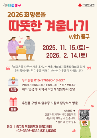 서울 중구(구청장 김길성)가 지난해 11월 15일부터 사회복지공동모금회와 함께 진행 중인‘2026 희망온돌 따뜻한 겨울나기’사업에 지난 1월 13일 기준, 구의 목표 모금액의 약 69%인 12억1천여만원의 성금·품이 모였다고 밝혔다.