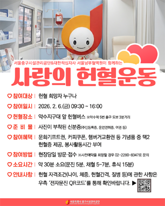 서울특별시 중구시설관리공단은 겨울철 급격히 감소한 혈액 수급난을 해소하기 위해 오는 2월 6일 '2026년 상반기 사랑의 헌혈운동'을 실시한다고 밝혔다.
