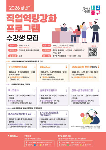 서울 중구가 오는 3월부터 5월까지 운영하는 직업역량강화 프로그램 상반기 과정에 수강생 160명을 모집한다.