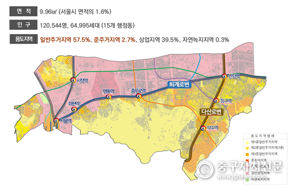 이번 용역 대상은 중구 주거지역 전체 5.73㎢ 다. 중구 면적의 60%를 차지한다. 중구의 용도지역 체계는 2003년 서울시 주거지역 종세분화 이후 큰 변화 없이 유지됐다.