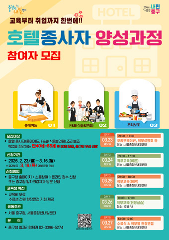서울 중구가 호텔업 취업을 희망하는 중장년을 대상으로 실무 중심 교육과 현장면접을 연계한 '2026년 1기 호텔종사자 양성과정'을 운영한다.