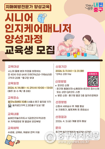 서울 중구가 치매예방 전문인력을 늘려 돌봄서비스 향상을 도모하고 중장년층 대상의 새로운 일자리를 창출하기 위해 올해부터 '시니어 인지케어매니저 양성과정'을 신설한다.