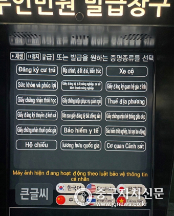 지원 언어는 영어, 중국어, 베트남어, 일본어, 태국어 등 5개 국어다. 초기 화면에서 원하는 언어를 선택하면 안내부터 발급까지 전 과정이 해당 국어로 전환돼, 타인의 도움 없이 43종의 서류를 손쉽게 발급받을 수 있다. 특히 시범 기기 두 대는 24시간 운영되어 야간과 주말에도 이용이 편리하다.