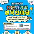 서울 중구(구청장 김길성)는 오는 11월 1일 오후 1시부터 5시까지 신당동 마을마당(청구역1번 출구 옆) 에서 ‘다문화가족 행복한마당’이 개최된다. 서울중구가족센터(센터장 정주원)가 주관하는 이번 행사는, 다문화가족과 주민 등 400여 명이 한자리에 모여 서로의 문화를 이해하고 어울리는 소통과 화합의 장으로 꾸며진다. 참여를 원한다면 포스터 내 그림무늬(QR코드)를 통해 신청할 수 있으며, 신청후 행사 당일 오후 1시까지 현장을 방문한 참가자에게는 소정의 선물도 증정된다. 행사 당일 오후 12시 30분부터 참가자 접수와 기념품 배부가 진행되고, 1시부터는 대학생 공연과 개회식이 열리며 축제 분위기를 한껏 달굴 예정이다. 오후 2시부터는 다채로운 체험 부스가 문을 연다. 행사장은 △글로벌존(Global Zone) △플레이존(Play Zone) △키즈존(Kids Zone) △에코존(Eco Zone) 등 누구나 즐길 수 있는 프로그램으로 채워진다. 먼저, ‘글로벌존’에서는 중국의 춤추는 용 만들기, 벨라루스의 행복인형 만들기, 멕시코의 선인장 선캐쳐 만들기, 일본의 대형 다루마오토시 체험 등 각국의 문화를 직접 체험할 수 있다. 또한, ‘플레이존’에서는 스톱워치