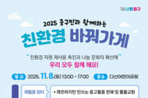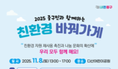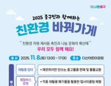서울 중구(구청장 김길성)는 오는 11월 8일 오후 1시부터 5시까지, 다산어린이공원에서 ‘2025년 중구민과 함께하는 친환경 바꿔가게’ 행사를 개최한다. 이번 행사는 일상 속에서 버려지는 물건의 가치를 다시 발견하고, 자원순환과 나눔의 문화를 확산시키기 위해 마련됐다. 재활용 장터, 업사이클링 체험, 환경 캠페인, 공연 등 다채로운 프로그램이 준비돼 있어 누구나 즐겁게 참여할 수 있다. 먼저 ‘재활용 장터’에서는 주민들이 직접 판매자로 나서, 깨끗하지만 사용하지 않는 물건들을 판매하거나 물물교환을 진행한다. 사전 신청을 마친 15개 팀의 주민 판매자가 참여해 의류·생활용품·육아용품 등 다양한 물품을 선보인다. 또한 버려지는 자원을 새롭게 탄생시키는 체험부스도 열린다. ‘플라스틱 뚜껑 랜드’부스에서는 병뚜껑을 조립해 작품을 만들고, 완성품은 전국 최초 쓰레기 연구소인 ‘새롬’에 전시할 예정이다. ‘책갈피가 된 비닐’ 부스에서는 버려진 비닐을 책갈피로 변신시키고, ‘새활용 키링 만들기’와 ‘커피박 샴푸바 만들기’등 다양한 체험이 진행돼 자원순환의 의미를 새긴다. 지역 기관들도 재활용과 환경 보호를 위해 동참했다. ‘유락종합사회복지관’은 재활용을 주제로 한 보드