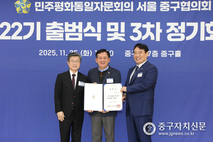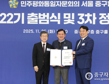 민주평화통일자문회의 서울중구협의회(회장 이웅현)는 지난 11월 25일 중구청 7층 강당에서 제22기 출범식과 함께 정기회의를 개최했다. 이날 김길성 중구청장, 박성준 국회의원(민주당 중구성동을지역위원장), 중구의회 윤판오 의장, 자문위원, 내빈등 100여명이 참석했다. 이날 출범식에는 대행기관장인 김길성 중구청장과 이웅현 신임 회장은 새로 위촉된 89명의 자문위원들에게 각각 위촉장을 전수했다. 그리고 자문위원들을 대표해 천안드레이(기획홍보분과위원장)·고하은(청년분과위원장) 자문위원이 “국법을 준수하고 조국의 민주적 평화통일을 지향하는 민족의 염원을 받들어 맡은바 사명을 성실히 수행할 것”이라며 선서했다. 이웅현 신임회장은 취임사를 통해 “이재명 대통령께서 최근 튀르키예 에르도안 대통령과 회담에서 ‘통일은 우리의 최종 목표이자 헌법이 부여한 책무이며, 어떤 일방적 방식의 통일도 지향하지 않는다’고 말씀하셨다”며 “이 메시지는 통일이 특정 진영의 과제가 아니라 국민 모두가 함께 만들어가는 미래의 과제임을 분명히 보여준다”고 밝혔다. 그는 “제22기 자문위원들은 이러한 시대적 요구속에서 △현장중심의 통일 여론 수렴 △청년과 여성의 적극적인 참여 확대 △스포츠와 연