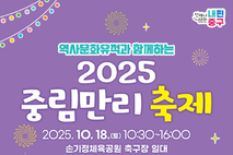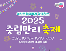 서울 중구(구청장 김길성)는 중림동 손기정체육공원 축구장 일대에서 오는 10월 18일 오전10시부터 오후 6시까지 ‘2025 중림만리 축제’가 열린다고 밝혔다. 올해 3번째로 맞는 중림동의 날(10월 둘째 주 토요일)을 기념하기 위해 중림동축제추진위원회(위원장 이성효)에서 주최하고, 학교, 복지관, 상인회, 도서관, 박물관 등 지역기관과 주민들이 참여해 흥이 가득한 소통의 장을 마련한다. 축제는 오전 10시, 중림동이 간직한 역사와 문화를 되짚는 ‘명소탐방 프로그램’으로 문을 연다. 사전 모집을 통해 구성된 초등학생 탐방단 20명이 해설사와 함께 손기정체육공원에서 출발해 서소문역사문화박물관과 중림동약현성당, 손기정기념관을 차례대로 탐방하며 흥미진진한 역사를 배우고 중림동의 새로운 매력을 발견하는 시간을 갖는다. 오전 11시 개회식과 함께 본격적으로 축제 분위기를 띄운다. 개회식에서는 모범 유공표창 수여식과 행운권 추첨이 진행된다. 이후 중림동 내 학교 학생들과 자치회관·복지관 수강생, 주민들이 준비한 13개의 공연 무대가 이어진다. △서울의료보건고 학생들의 댄스와 풍물패 △환일중 학생들의 드론쇼 △봉래초 학생들의 방송댄스 △중림복지관 수강생들의 고전무용과 밸