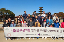 중구문화원(원장 남월진)은 지난 11월 12일 문화원 임직원 및 회원 39명과 함께 충남 부여 일대로 지역문화답사를 실시했다. 이번 답사는 지역문화원 간 교류 활성화와 중구문화원의 향후 문화사업 방향을 모색하기 위해 마련됐다. 이날 답사단은 오전 10시 30분 부여문화원에 도착해 부여문화원장 및 임직원의 환영을 받으며 공식 일정을 시작했다. 양 문화원은 대강당에서 기념선물 교환을 진행하고, 두 기관의 교류 의지를 재확인했다. 이어 부여문화원 사무국장이 부여문화원에 대한 현황을 소개했고, 김미영 팀장이 현재 전시 중인 ‘한국 옛지도 특별전’에 대해 설명하며 부여문화원이 추진 중인 지역문화기록 사업을 공유했다. 답사단은 이후 박경남 전문 해설사의 안내로 백제시대의 고건축 양식을 대표하는 정림사지 5층 석탑을 탐방했다. 정림사지 석탑은 백제의 단아하고 우아한 미감을 온전히 담고 있는 유적으로, 참가자들은 세련되고도 소박한 백제 미학의 정수를 생생한 해설과 함께 접했다. 점심 식사 후에는 부여국립박물관을 방문해 백제의 세계적 걸작으로 평가받는 국보 금동대향로를 관람했다. 특히 손상 없이 완전한 형태로 발굴된 금동대향로의 정교한 조형미는 참가자들의 큰 감탄을 자아냈다
